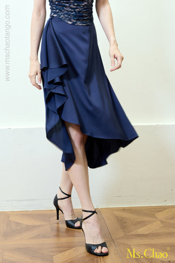 Asymmetry flare skirt with ruffles and side zipper. Poly satin, 96% Polyerster.4% Spandex Make...