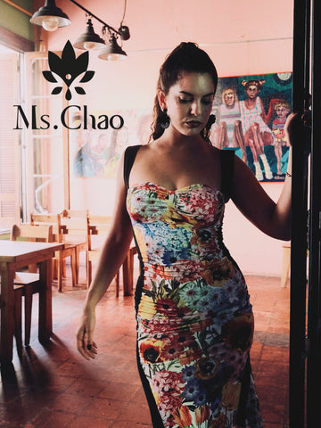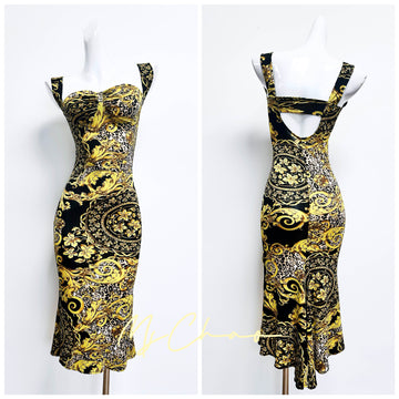 A sculptural mermaid dress in a bold yellow leopard-and-flower print, featuring a corset-inspired bodice with...