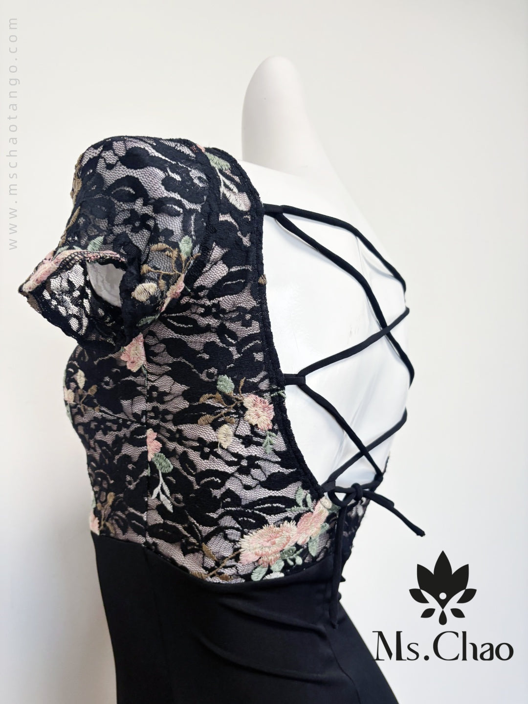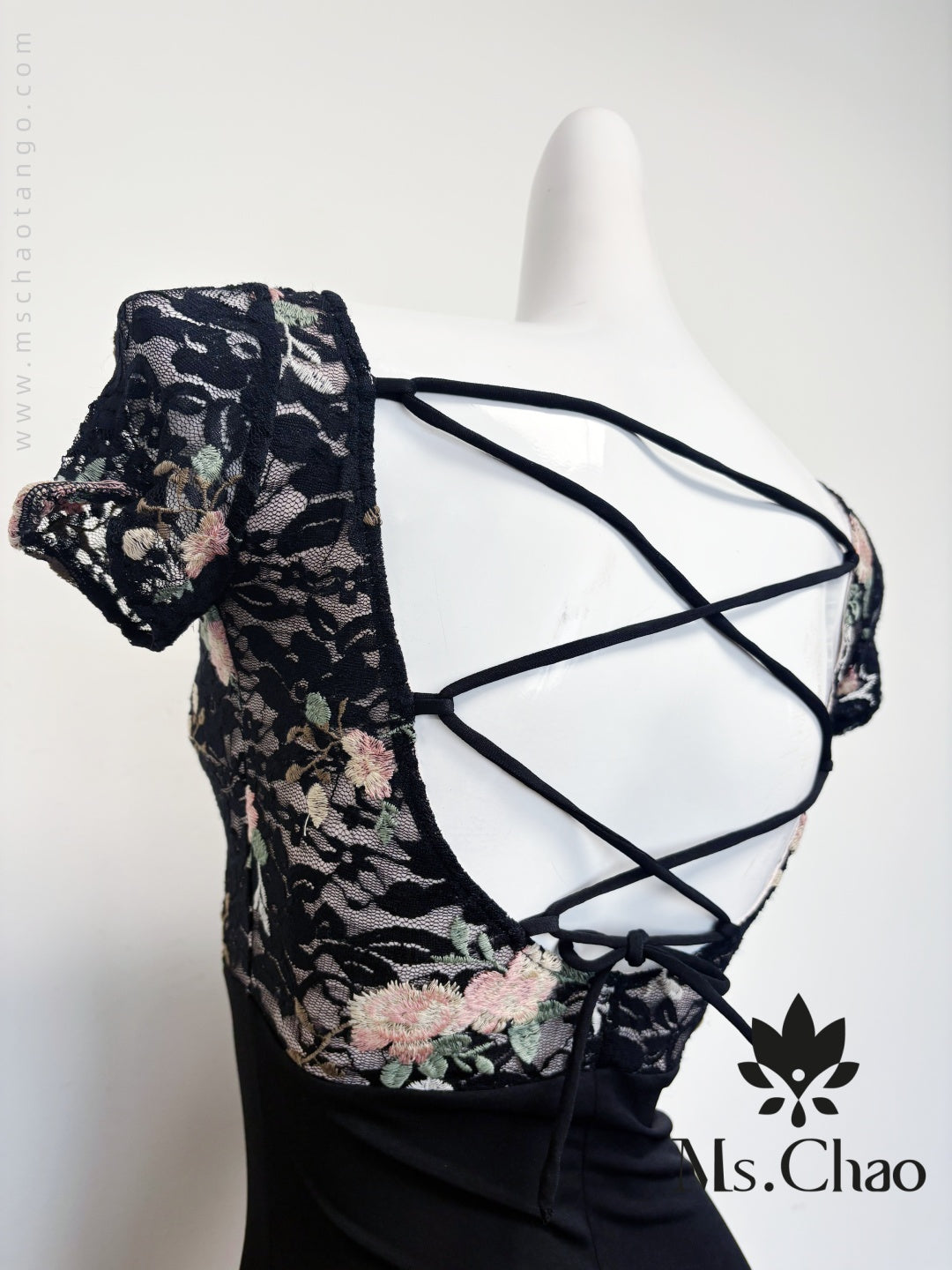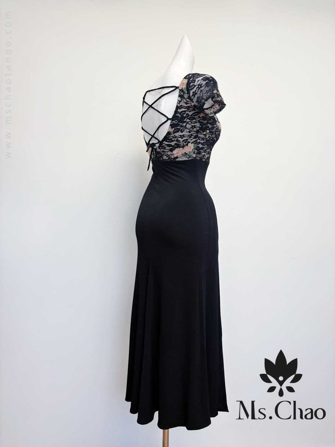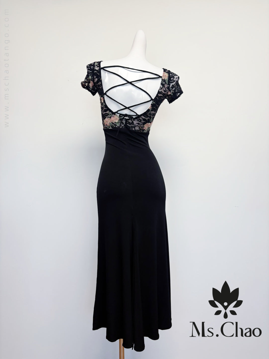 • Short-sleeved lace netted cross-over backless fishtail dress.