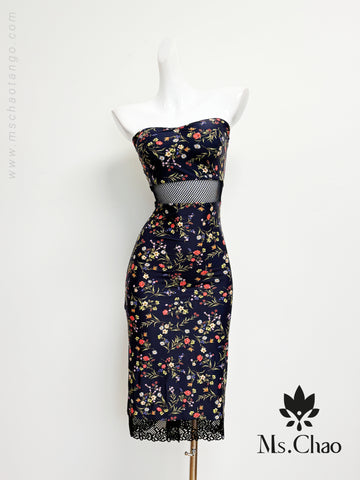 Sexy tube dress joined with navy lace at wasit and hem. Soft bra pads matte...