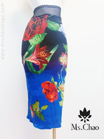 Flare skirt with 2 slits, Right font slit + back slit, back zipper. Poly printed...