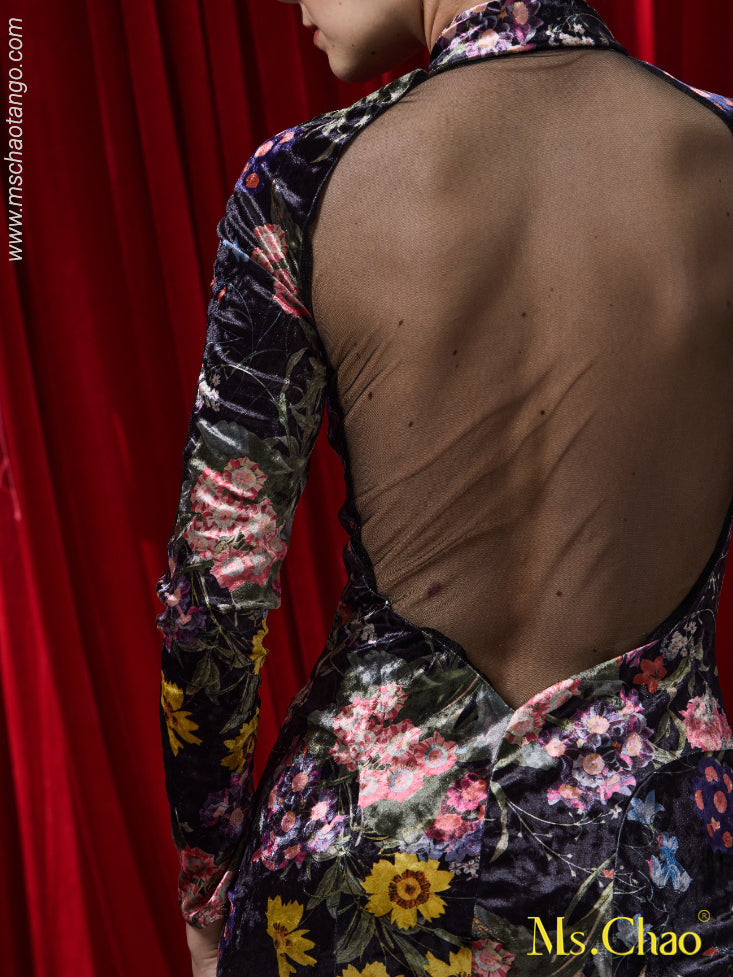 - A fish-tail dress with a cheongsam collar and long sleeves, featuring a patchwork design of mesh and printed velvet.